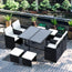 - Nine pieces: one table, four chairs and four stools - plenty of room for everyone to gather round