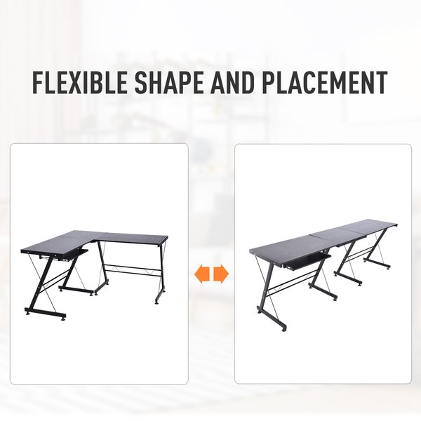 Never be stuck for a desk again, no matter the shape of the area thanks to this modern desk. Made with a powder-coated steel frame for reliability and strength that supports up to 20kg, it features three spacious and laminated worktops made from MDF top for a sleek and attractive look that's also very easy to maintain. Changeable to either an 'L' shape or completely straight, this is a desk that truly caters to you and your requirements, with a slide-out keyboard tray and adjustable feet to keep stable for the finishing touches. A superb addition for every home and office.