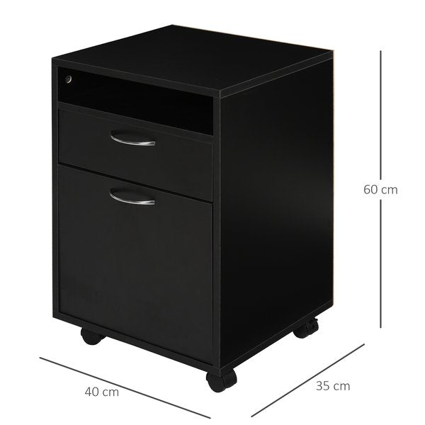 Marrying a sleek design with moderate storage space, this filing cabinet from will bring plenty of stylish functionality into your home or office. It features a large drawer, a small drawer and an open compartment, giving you lots of room to organise so you can find your work quickly and easily. The frame is made from particle board - it is solid and sturdy for reliable everyday use, with the four wheels making it easily to move around: two of which can be locked to keep the unit in place. It's finished with silver-coloured metal handles for an effortless design.