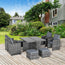The Outsunny 9-piece outdoor wicker dining set with cushions is suitable for any occasion. The elegant rattan dining set includes 1 table, 4 armchairs and 4 footrests made of aluminium frame and PE rattan. The wicker and tempered glass table combination looks fashionable and create a modern style for your living area.