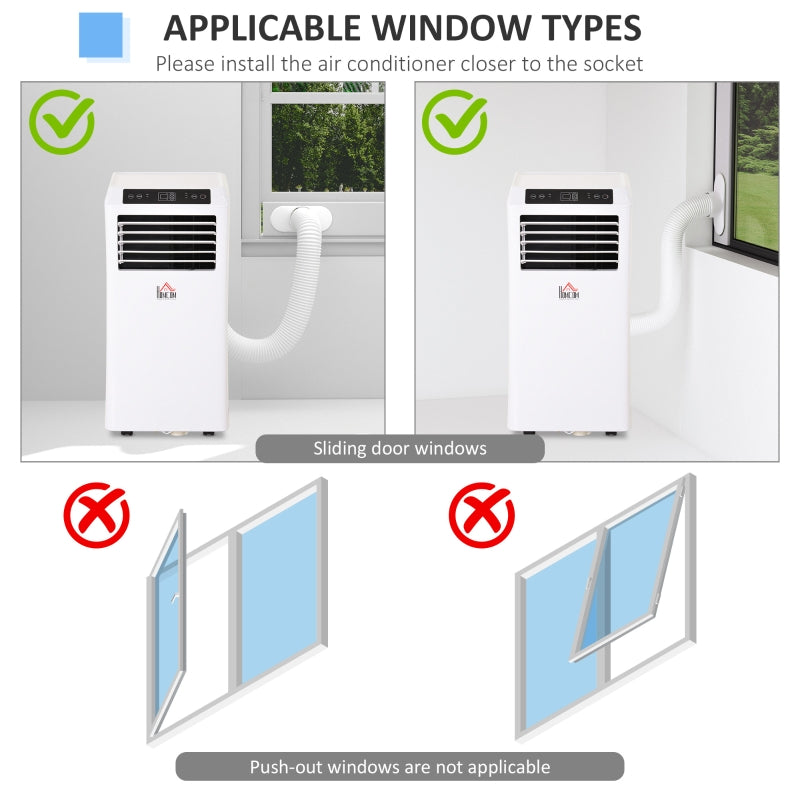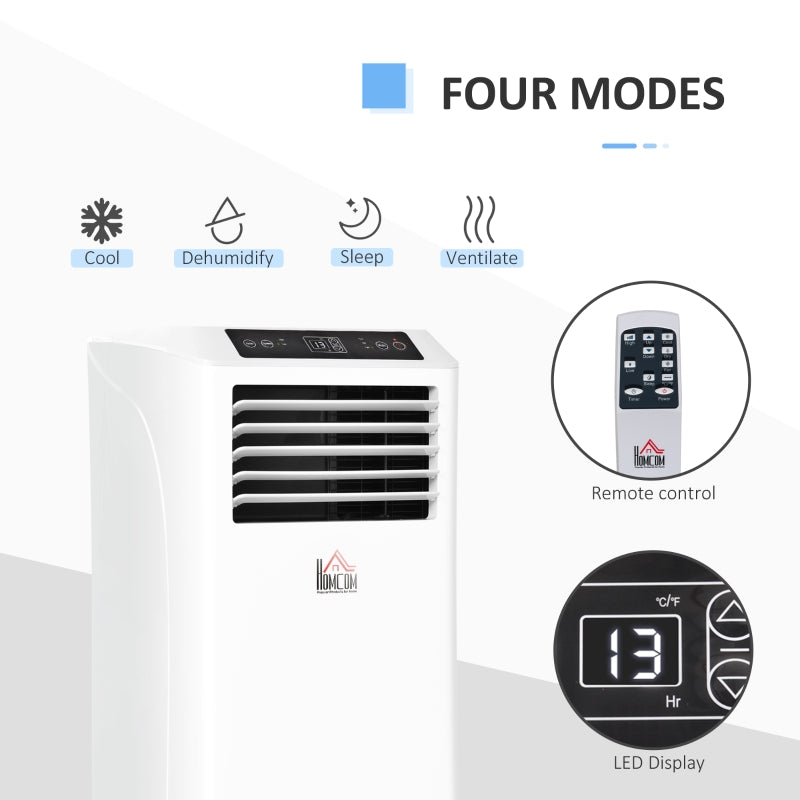 Beat the Summer heat in the most effective way possible say hello to this 1080W mobile air conditioners from HOMCOM. A small and compact design which can fit into small and tight spaces easily. A built-in 24 hour timer allows you to set the air con unit to run until a certain time perfect for when you want to use it getting to sleep but don t want it on as you wake up, with its auto shut-off function preventing electricity being wasted when the tank is full. Remote control included.