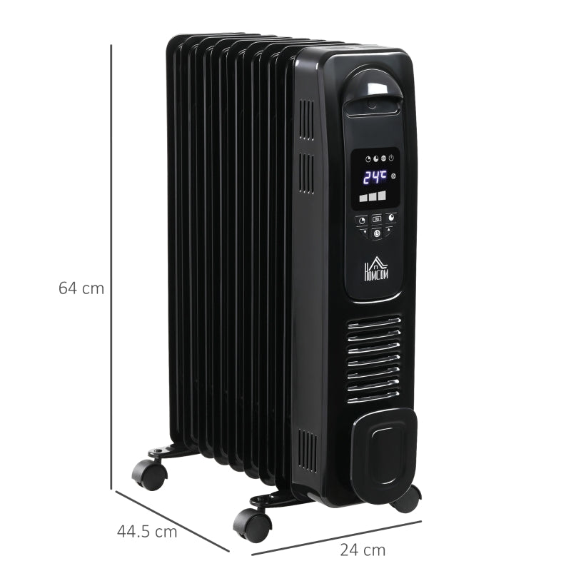 Keep warm with this oil filled radiator from HOMCOM. With 9 heating fins, an adjustable temperature of 7-35 and 3 heating modes, you're in control of the heat you want. Cut down energy costs by choosing ECO mode. The overheating and tip-over function will turn it off safely, so you can enjoy this portable radiator with peace of mind. Move with minimum fuss using the wheels and handle, making sure no room goes cold. Comes complete with a 24 hour timer, setting it on and off whenever you want.