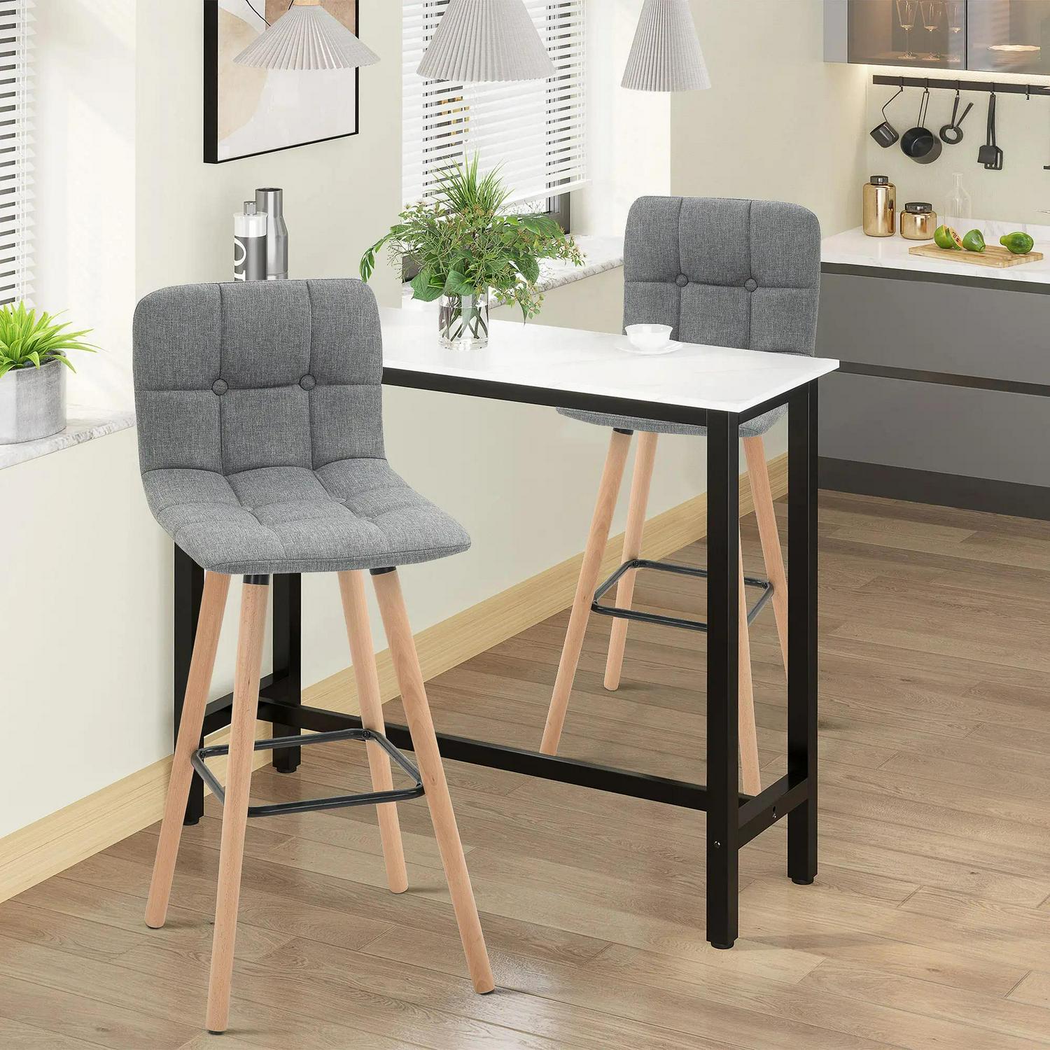 Time take to sit and enjoy your meal and other dining times - with full help from these HOMCOM bar stools. The frame is made from wood to fully support you and the stool, formed into an 'A' shape to promote balance. There's a bottom bar to hold your feet - no legs left dangling. The square seat, placed on top, is filled with sponge for comfort, with a mid-rise back to offer support. Line indenting with button tufting completes these kitchen stools for plenty of style points.