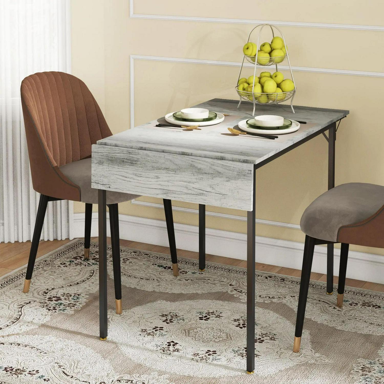From two, to four in an instant. This HOMCOM drop leaf table is an ideal piece for smaller homes. Lift up both sides of the wood-effect tabletop to easily create more space, for an abundance of dinners, work and more. The frame is made from steel for a strong core, so you'll be supported when using this dining table. Complete with adjustable feet so it keeps balanced when needed.