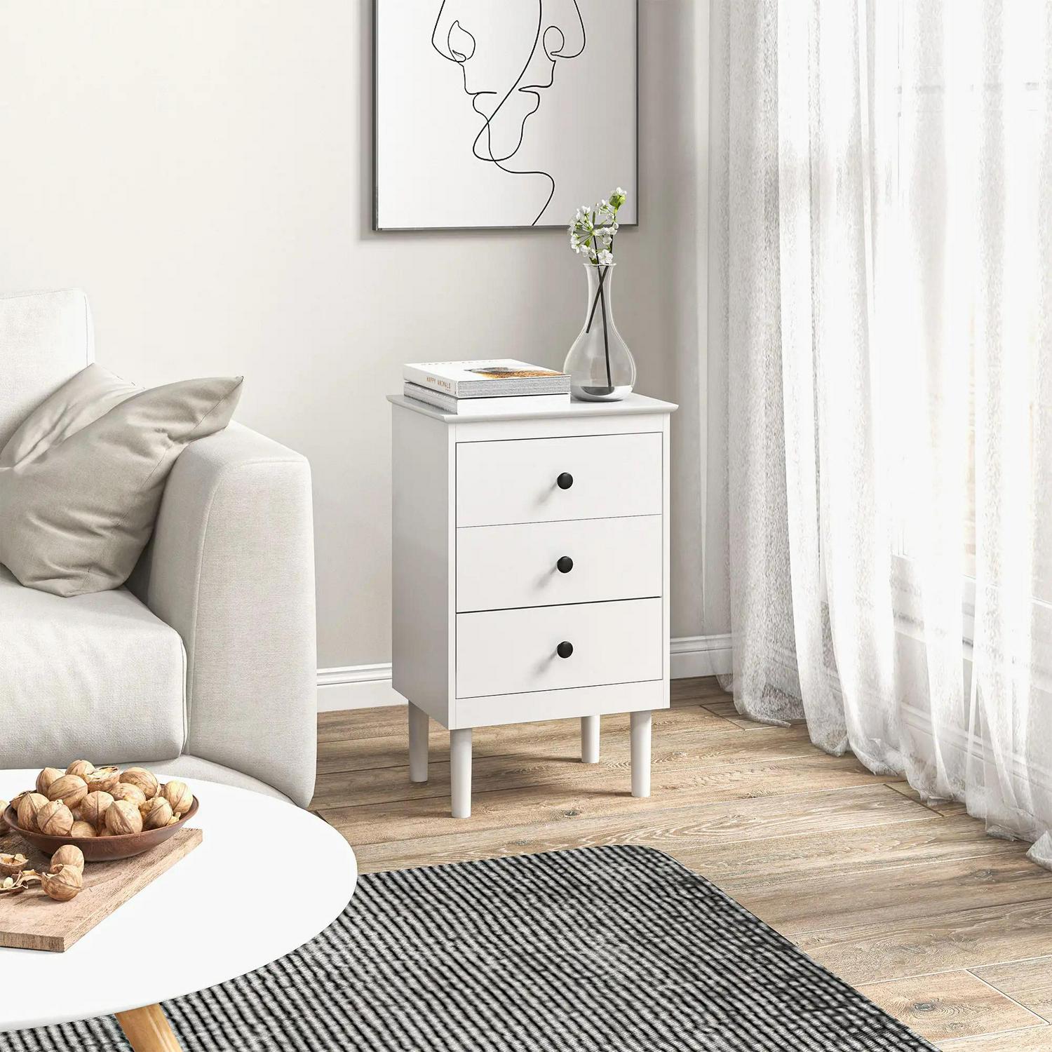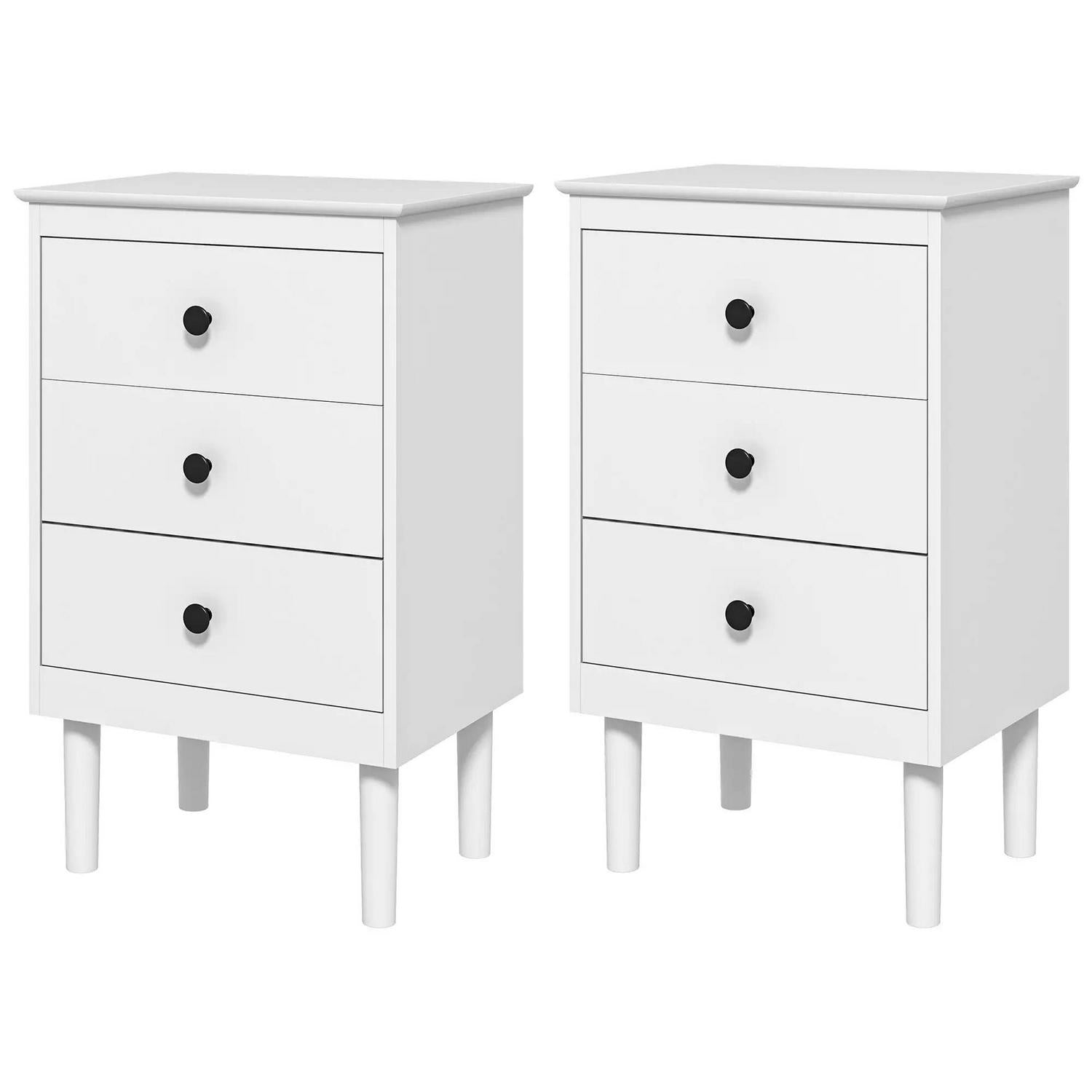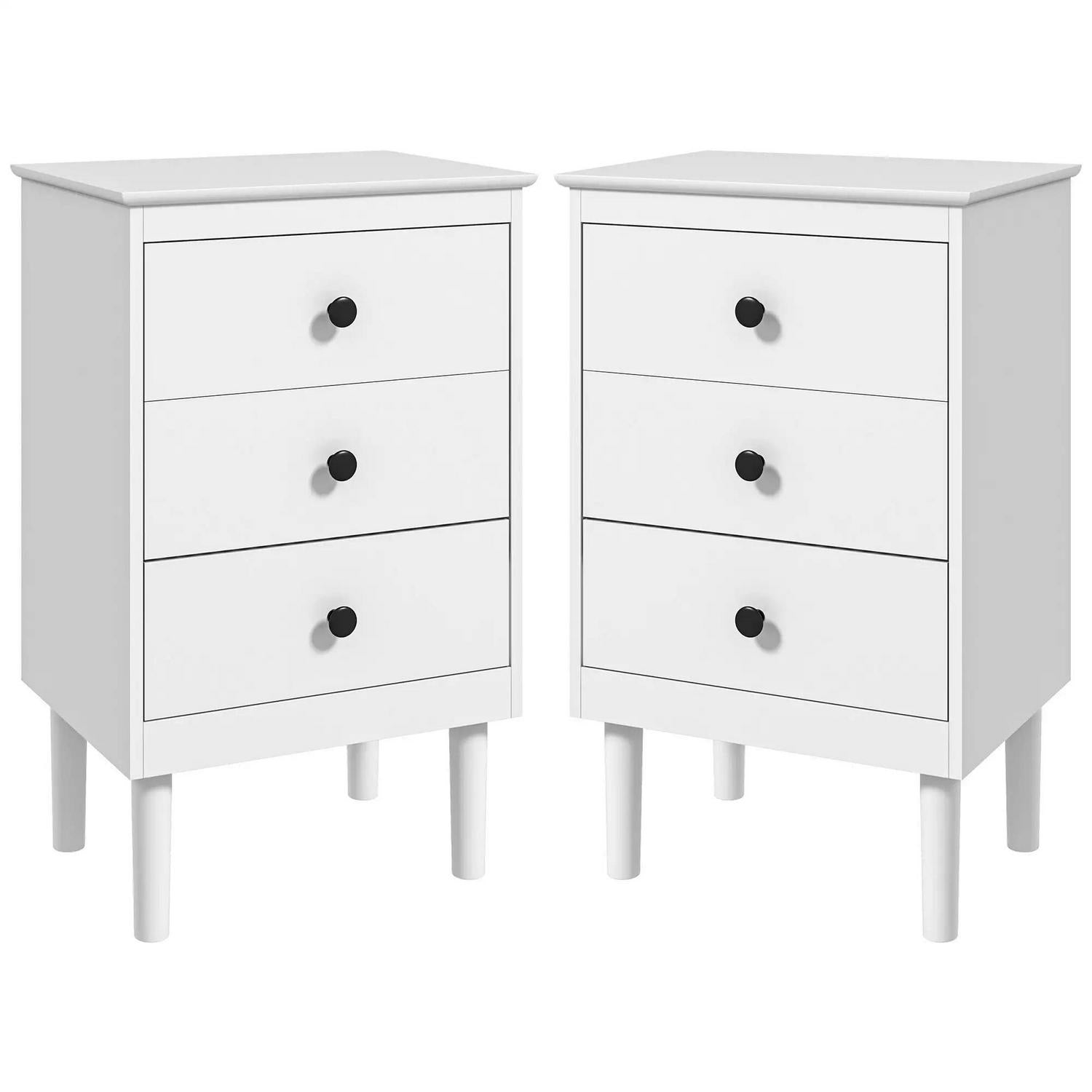 Simple style for all homes, offering plenty of nighttime space: say hello to these two HOMCOM bedside tables. In a clean white boxy design, they are super easy to welcome into your home interior style; the black handles add a touch of striking contrast. Three drawers offer handy holding room, with a flat tabletop to make space for essentials like an alarm clock. Made from particle board, each nightstand is reliable, with anti-tipping straps to securely fix to the wall.