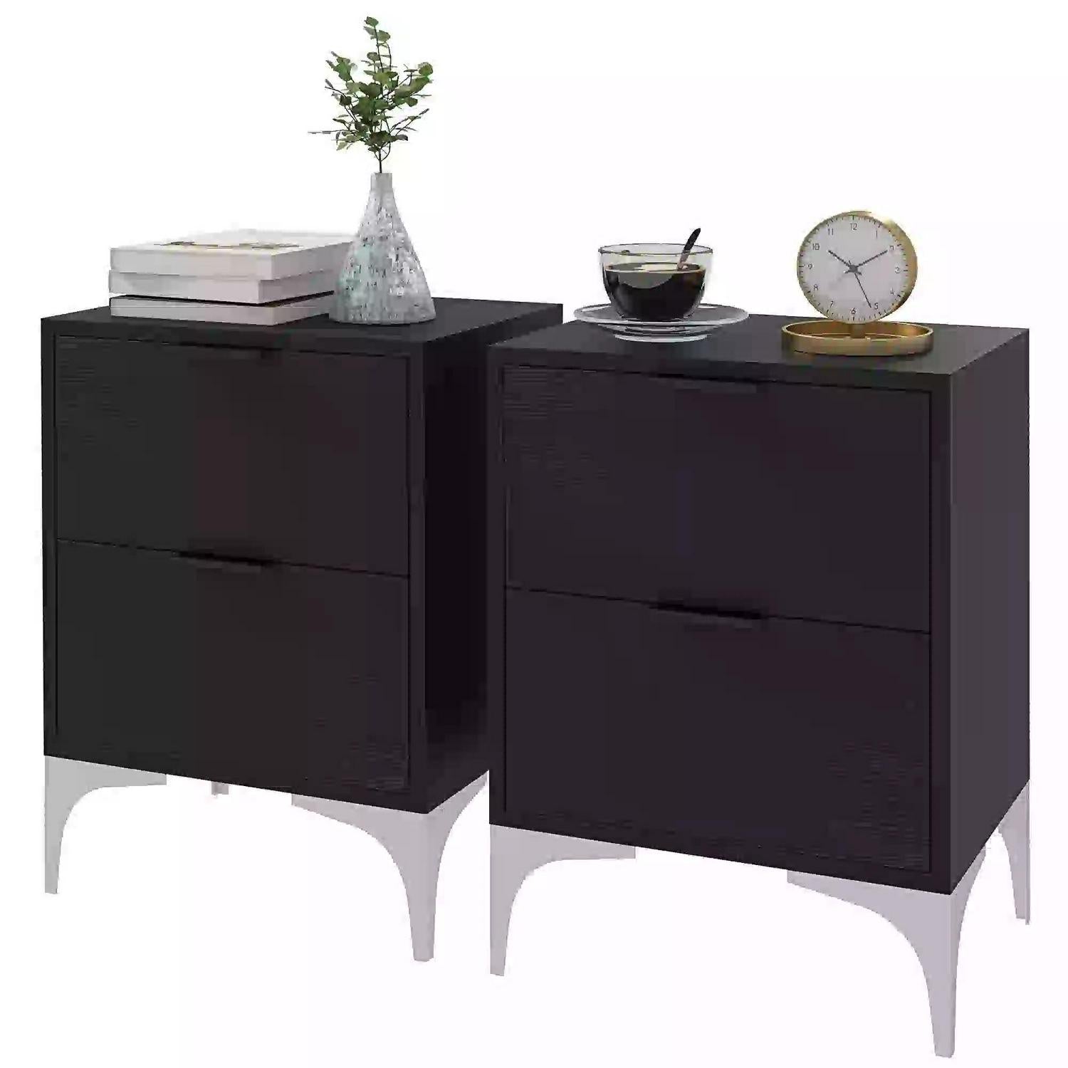 Pair together or style apart these HOMCOM bedside tables. In a wood effect design, these two nightstands are classically stylish, and mixing them with your current furniture is practically effortless. Made from particle board, they are sturdy and suitable for everyday use, with two drawers to hold plenty of bedtime essentials. Use the tabletop for extra holding space. Finished with steel legs for strong support.