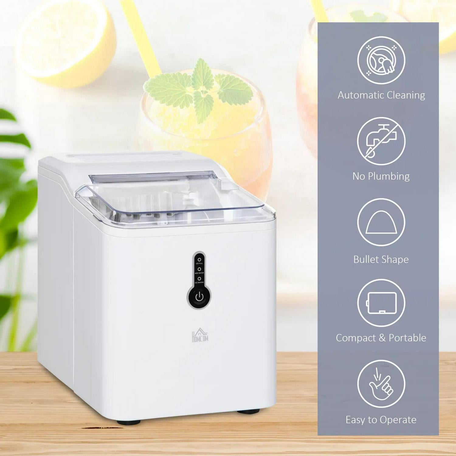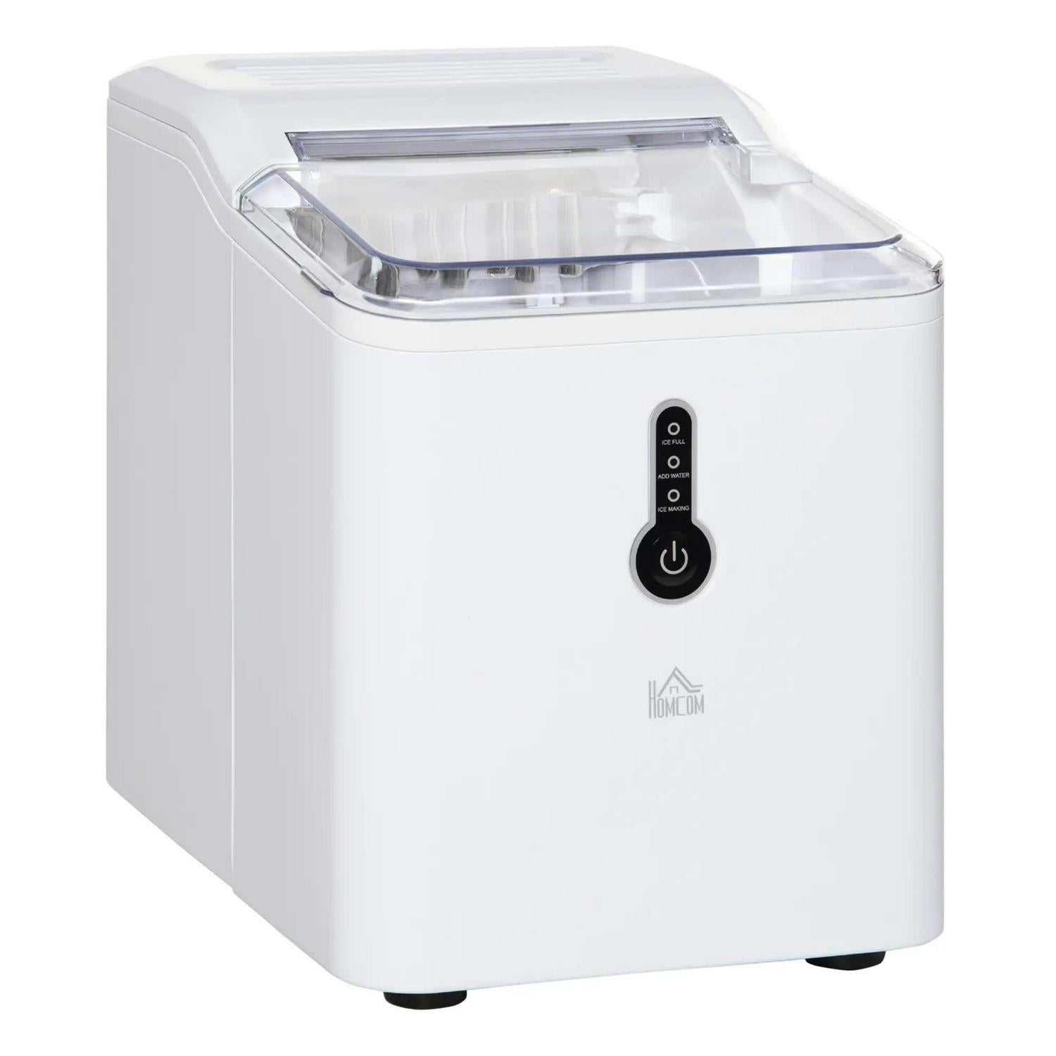 Need ice in an instant? Then get this white ice making machine from HOMCOM. Clean white and stylish, it'll look great anywhere - from the home kitchen to office communal areas: a really versatile piece, with the compact design meaning you can have it almost anywhere. 1.5 litre capacity makes 12kg ice in 24 hours - with 9 pieces within 8 minutes, so you can enjoy cold drinks almost instantly. Complete with a drainage hole to empty easily.