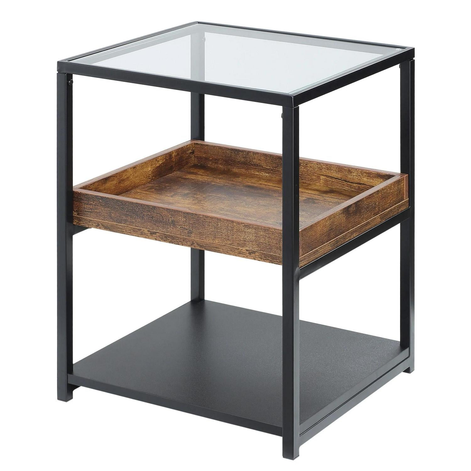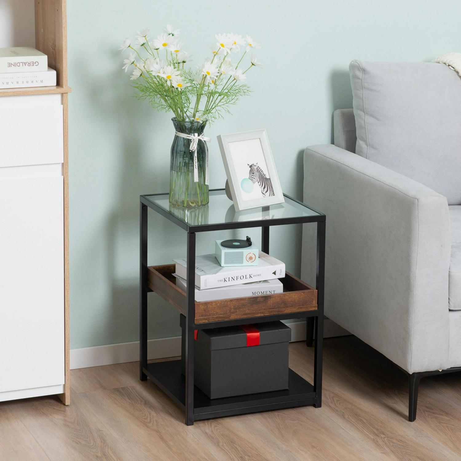 A unique take on home display and storage lies with this table/nightstand from HOMCOM. Three different layers: top glass shelf, middle wood-effect tray and bottom metal shelf for a combination of style and helpful holding space. The middle tray has small sides to try prevent items falling out. The glass top offers a sleek look and a solid holding place for all items. The frame, made from steel, is sturdy, supporting up to 15kg in total.