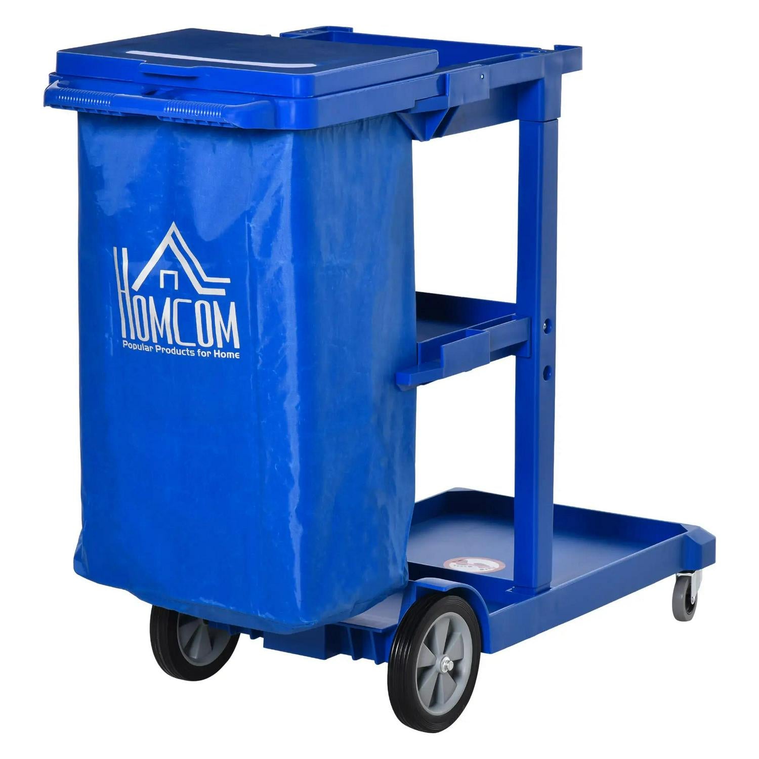 Make cleaning routines as efficient as possible. This HOMCOM janitorial cart is a multi-feature design: a plastic bin bag, a top tray, two shelves and side hooks: room for keeping rubbish, brooms, mops and cleaning supplies. You can also move a wet floor sign around you for other people's safety. Made from plastic, this is tough piece - complete with wheels and handle to push/pull around easily.