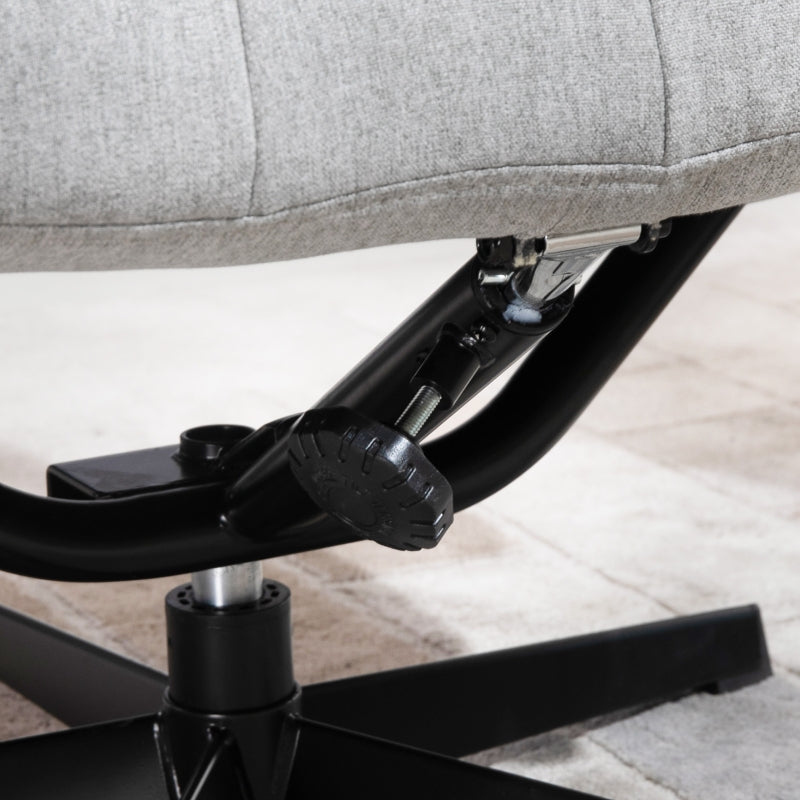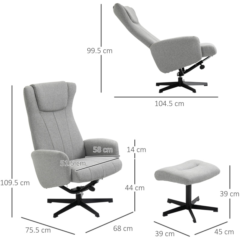 Don't settle for just any chair, lounge into comfort with our HOMCOM 2 pieces recliner and ottoman set with plush padding, ergonomic design, lockable positioning, and a 360 degrees swivel. Soft, breathable linen fabric is comfortable and easy to maintain and clean. A plush foam allows you to sit for extended periods of time in complete comfort. Perfect for home and office lounging, this chair will fit into all decor schemes while providing a super comfortable seating arrangement.