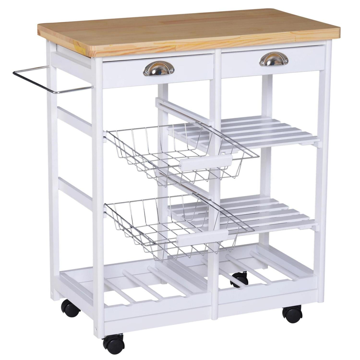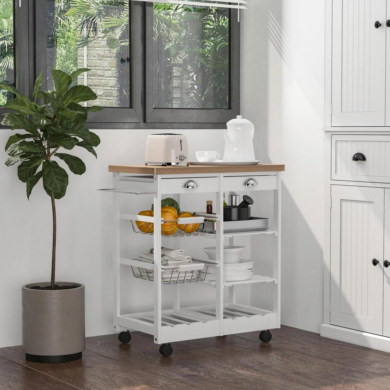 This Homcom mobile kitchen trolley is a great unit to have in the kitchen, gives you an extra work space with the ability for storage. Made from MDF and pine in a 3 tier design and a useable worktop. The trolley offers lots of space to organize on shelves, baskets and in the two drawers, There is a 6 bottle wine rack on the bottom shelf for you favorite drink. The trolley also sits on wheels which makes it easy to move around and locate in your ideal position. A great item to have in any room décor.