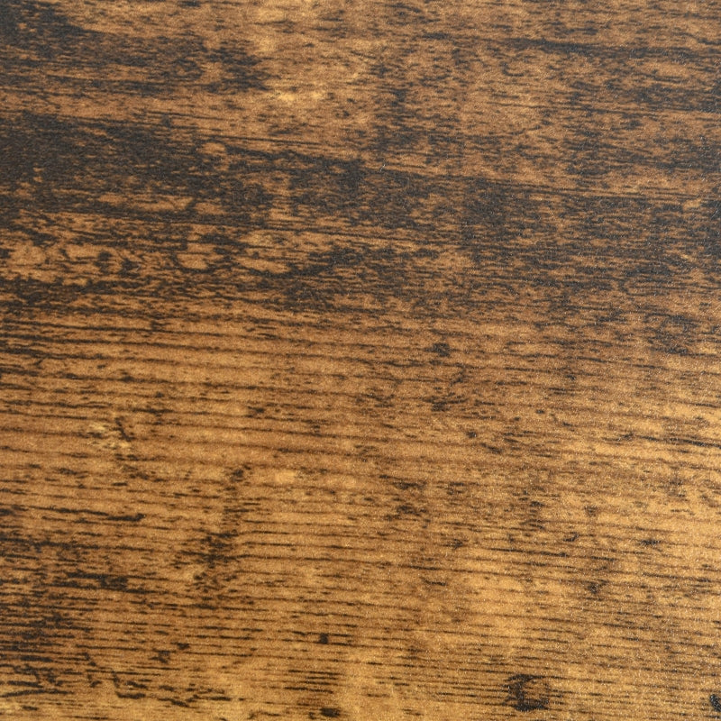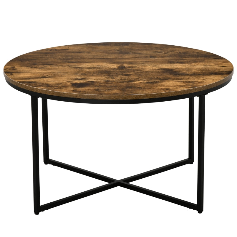 With its rustic brown tone, large round top and industrial base, you'll love inviting this round coffee table into your home for a sleek and contemporary look. The metal frame in a unique cross-over design for continual stability. Using particleboard for a solid surface, a melamine coating on the top gives it a smooth finish for easy cleaning. This low coffee table features a large tabletop, which offer large space. It's completed with adjustable footpads to protect your floor and keep stable.