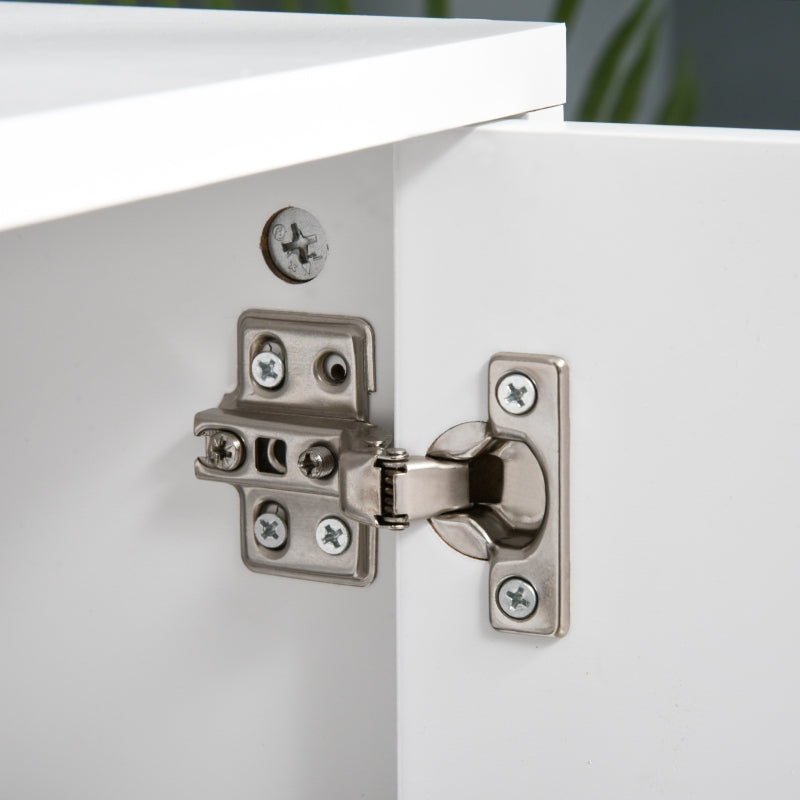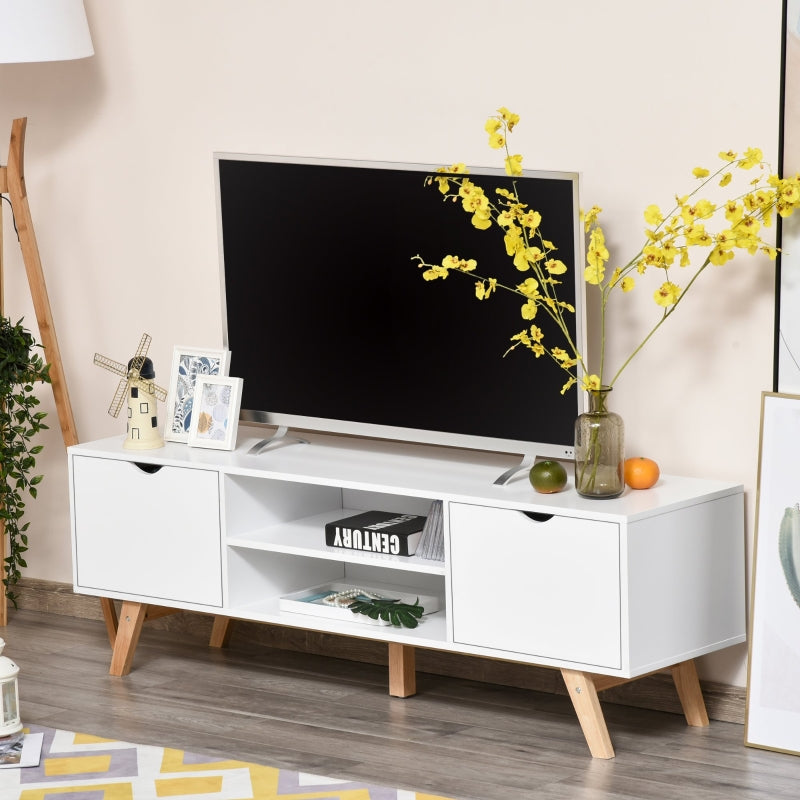 Bring minimal elegance into your home for maximum impact, thanks to this TV stand from HOMCOM. Using a blend of particle board and MDF for the frame, it is crafted into a space-utilising design, featuring two end cabinets and two middle compartments, providing plenty of open and discreet room for media unit and electronics. A rubber wood base provides balance and stability, and it is finished with a spacious worktop and cable holes on the back.
