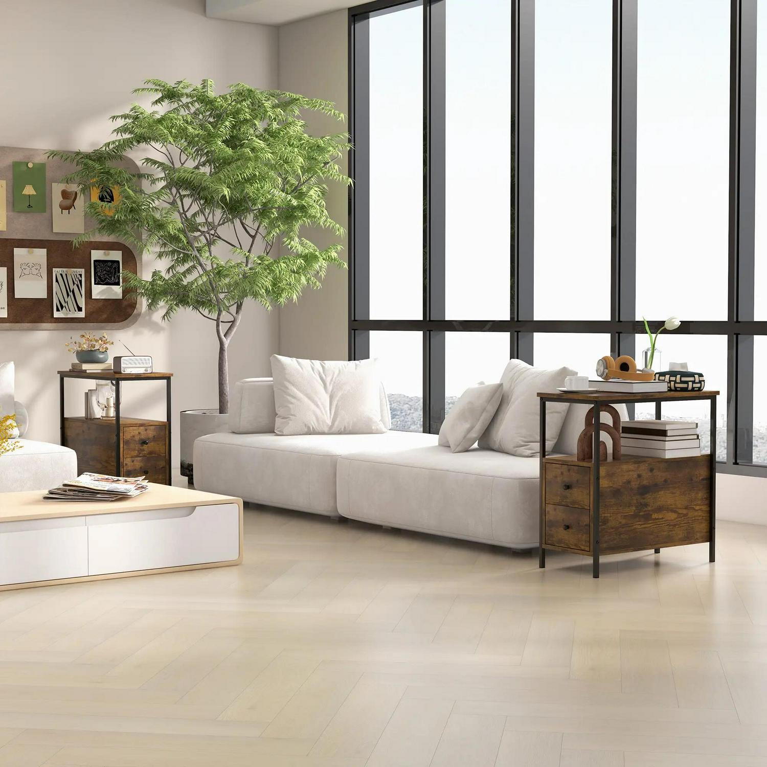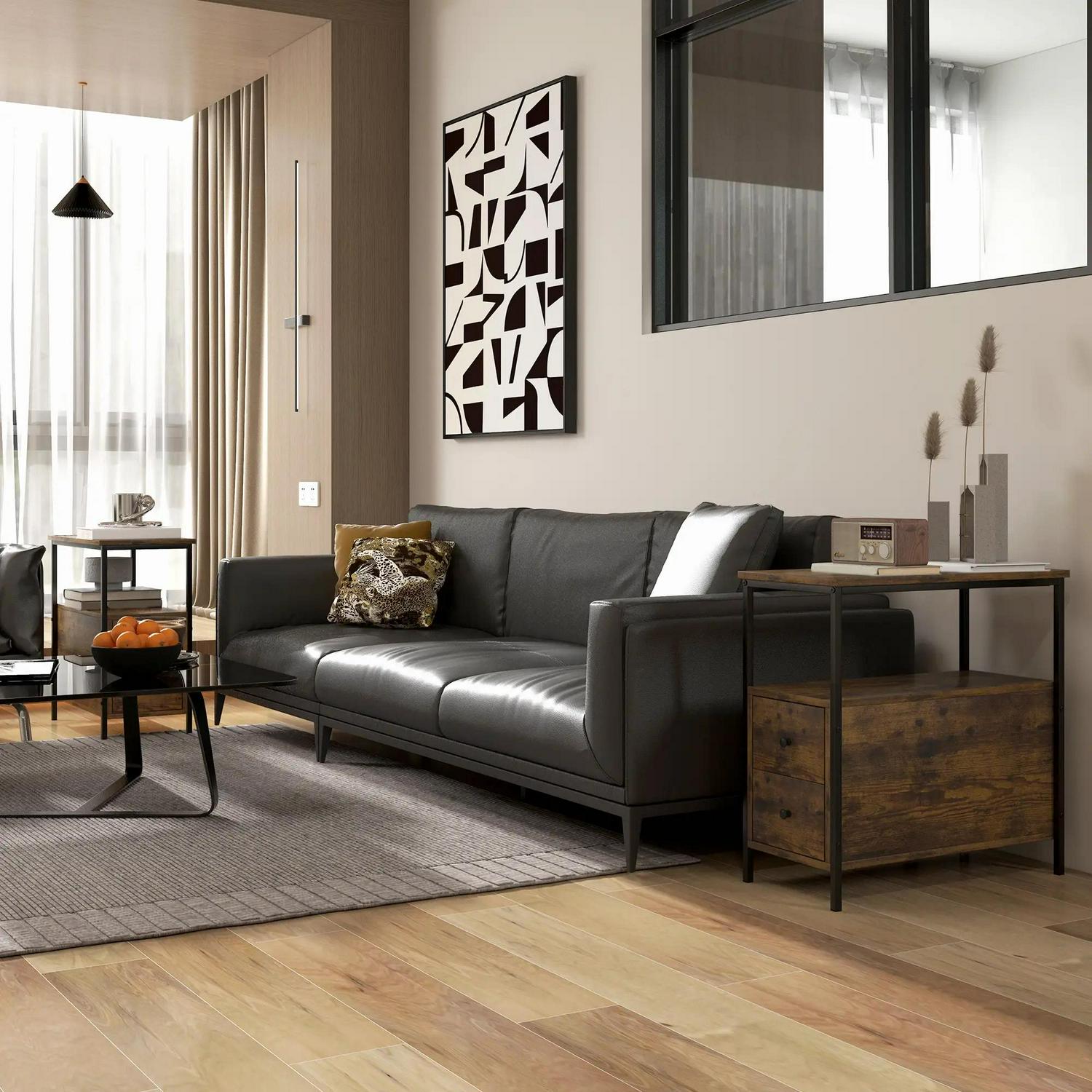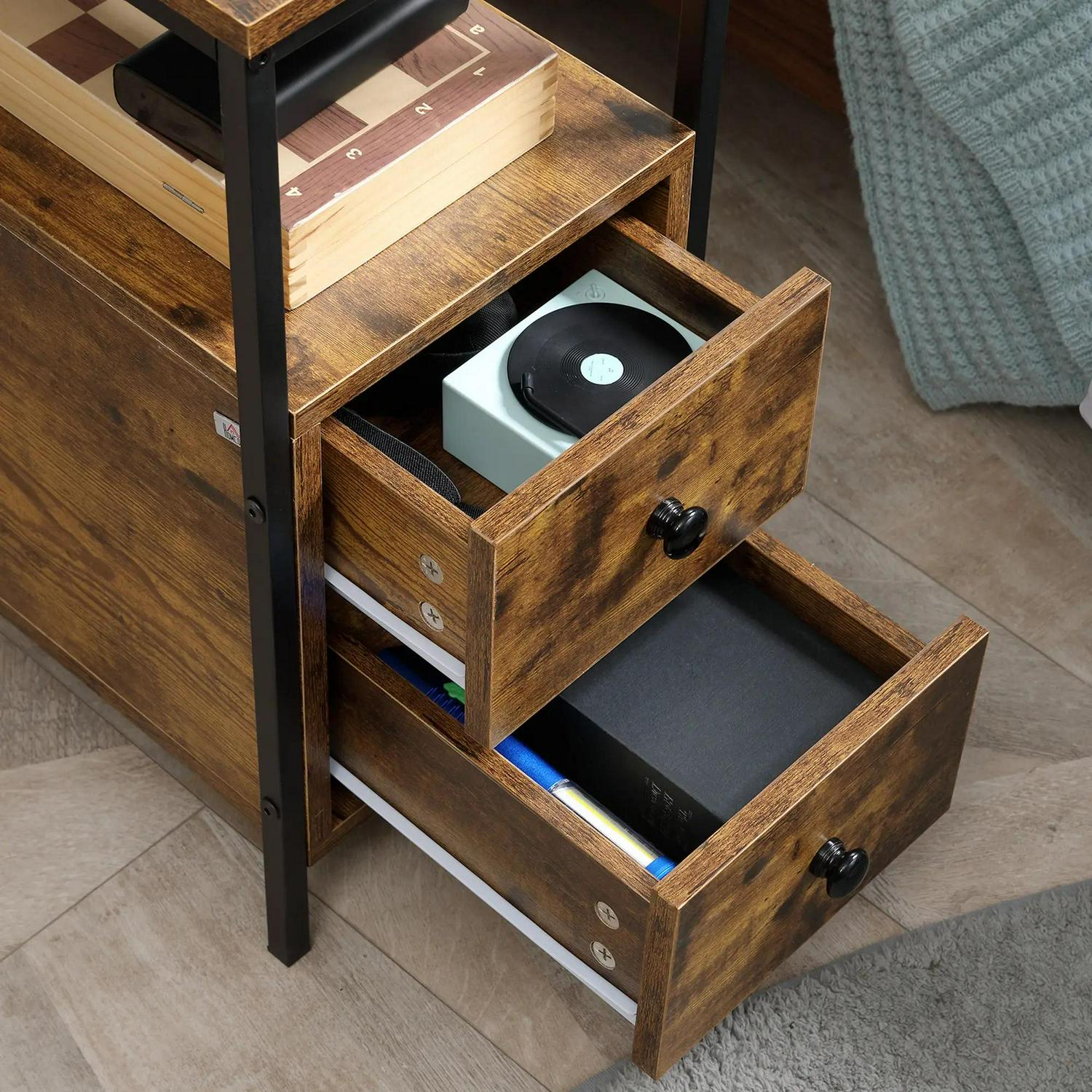 Storage to use wherever you want, in a stylish Industrial design. Use this set of 2 side tables in the bedroom, the hallway, the lounge, the office - wherever you want. A beautiful Industrial-style design, the stained wood effect of the body will draw attention to itself with ease. They feature two bottom drawers and a middle and top shelf - plenty of storage room. The metal frame is strong, so it stands proud in place.