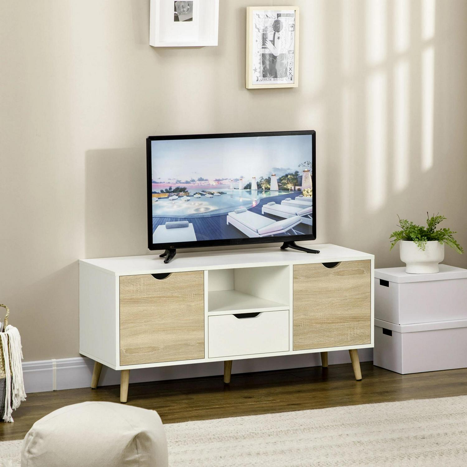 Upgrade your living room and entertainment area with this modern HOMCOM TV stand cabinet. Blending together wood effect doors and a white structure for modern style, this entertainment unit looks great all throughout the home. Formed of a wide top, middle open shelf, drawer two end cupboards. The TV console complete with wooden legs to support properly.