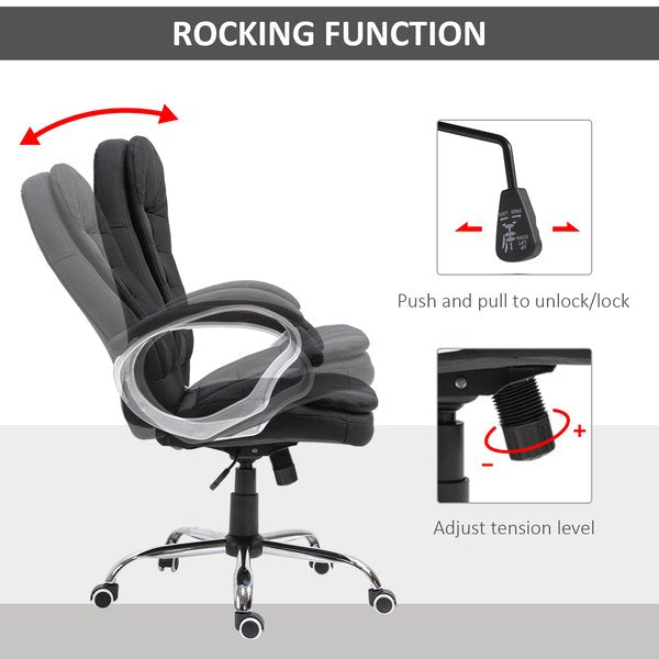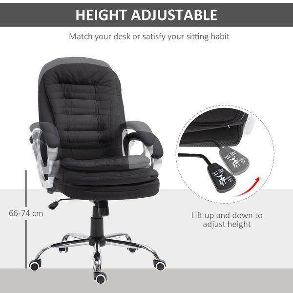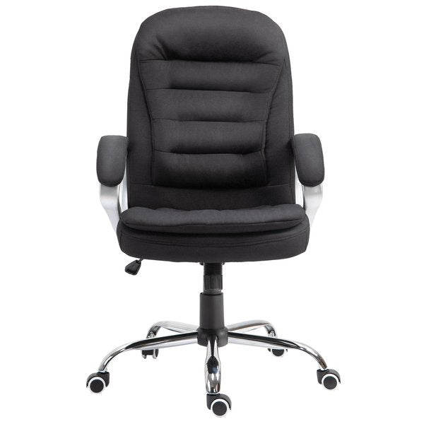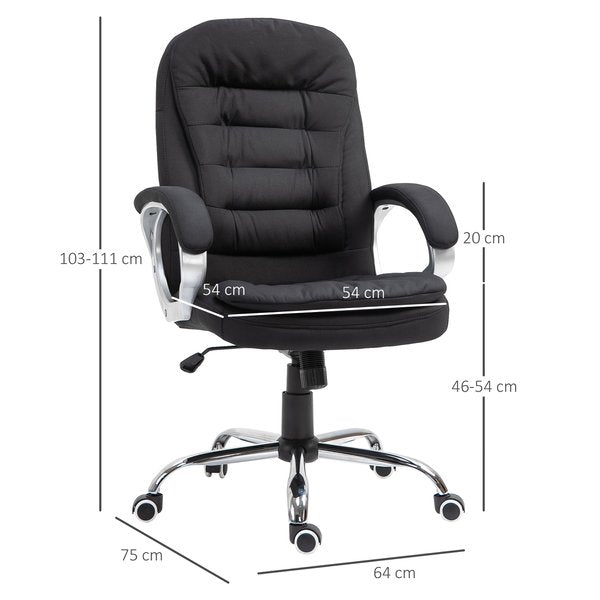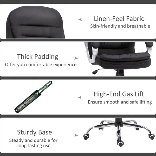 Made with supreme comfort and style in mind, this black office chair is the perfect accompaniment for you. Its ergonomic design ensures you are correctly supported whilst seated thanks to the adjustable height, high armrests and high back, helping to decrease any ache that can occur from incorrect seating. Padded all over for maximum comfort. A 360° swivel base for easy movement, with linen upholstery to finish that allows your skin to breath. An ideal desk chair for you.
