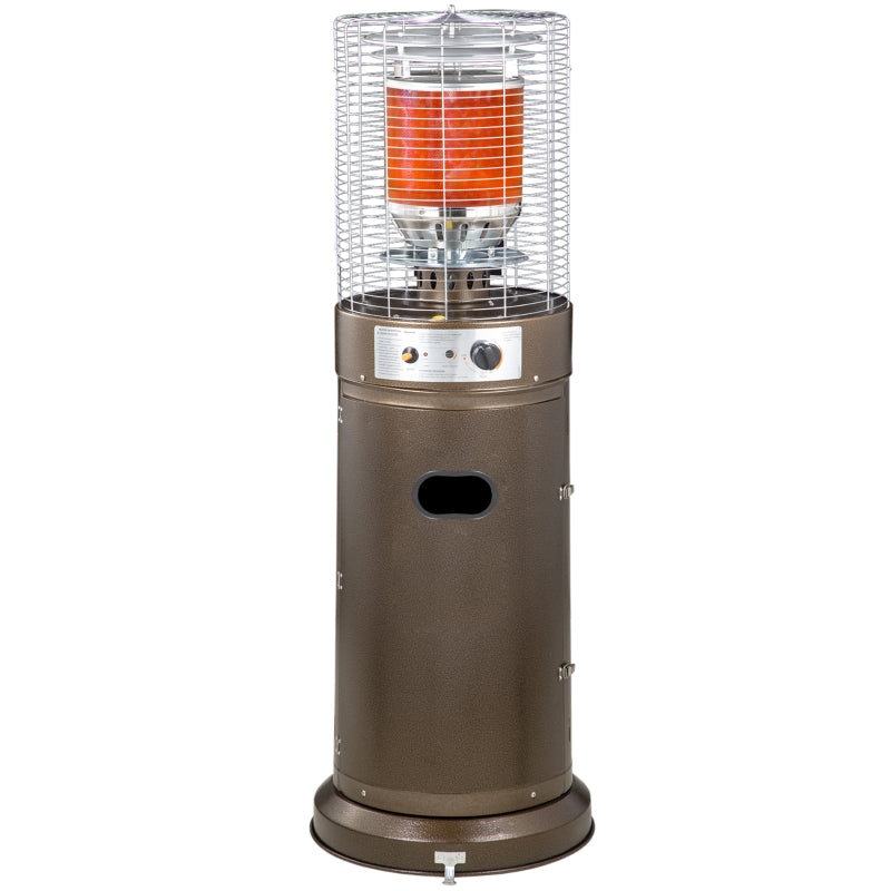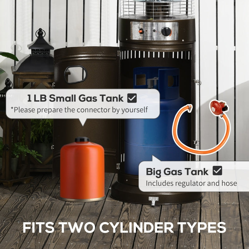 Bring warmth outdoors when the temperature drops with this standalone patio heater from Outsunny. Made from metal for stability and durability, it is crafted into a minimalistic and unobtrusive design that blends in with outdoor furnishings easily. Powered by either propane, butane or liquid petroleum gas, the temperature output is adjustable from 5kW to 11kW, giving you greater control on how warm you want to be. With two wheels for easy movement, it is finished with a tip-turn-off switch for extra safety if it falls over. It will make you love your outdoors even more. CE certified.