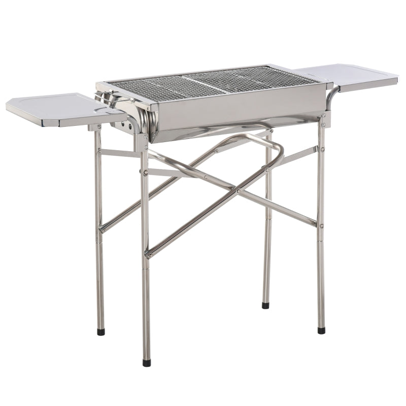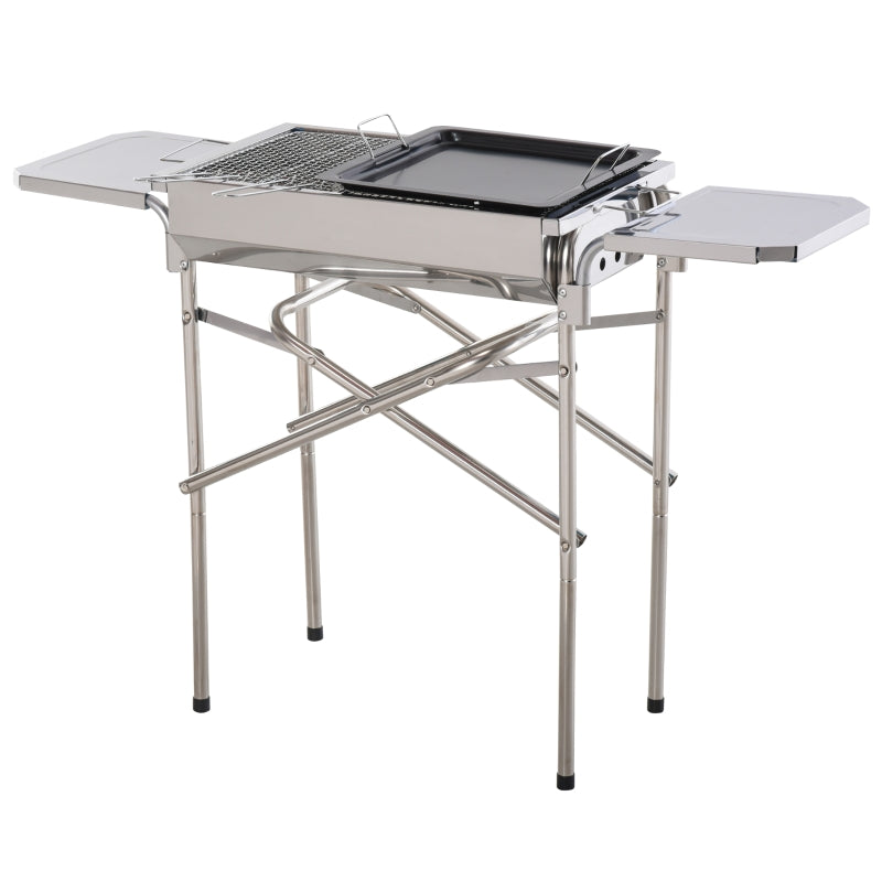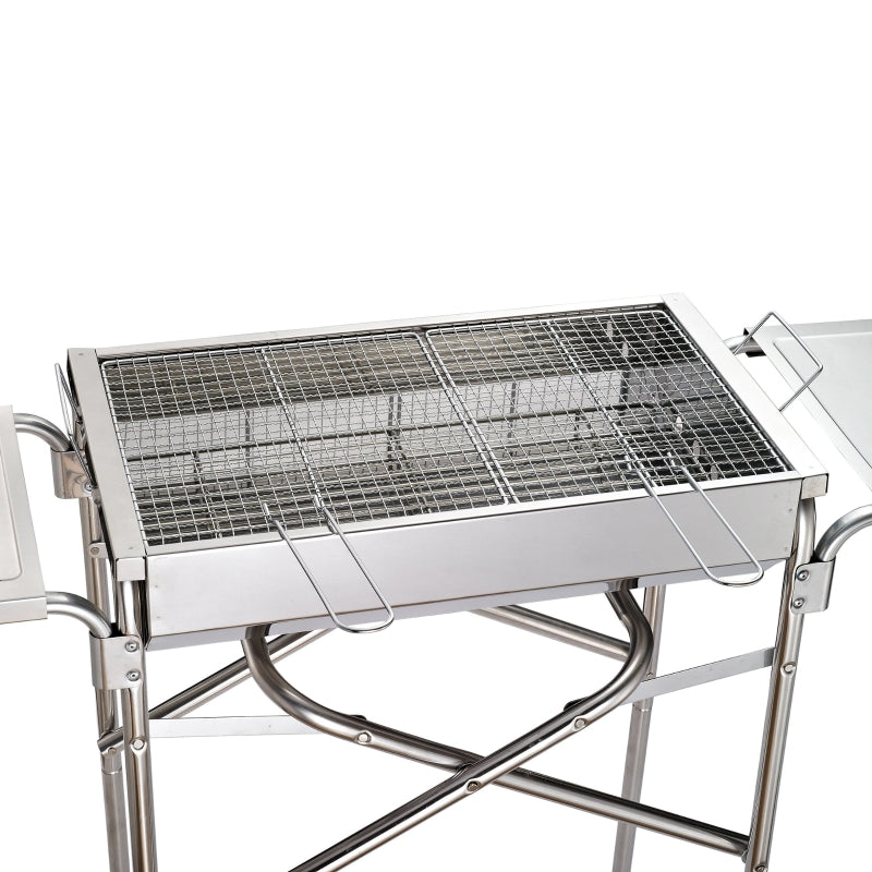 Sleek and stylish summer BBQs start right here with this smoker bbq grill from Outsunny. Crafted from stainless steel, the body is durable and reliable. 68cm in height, it is fitted with an oblong carbon grill to cook lots of food, with a frying plate also included to switch up the cooking style if wanted. With side shelves to hold plates, cutlery, condiments and more. It s finished with a removable base, which ensures stability when in use, also can be folded away easily for compact storage.