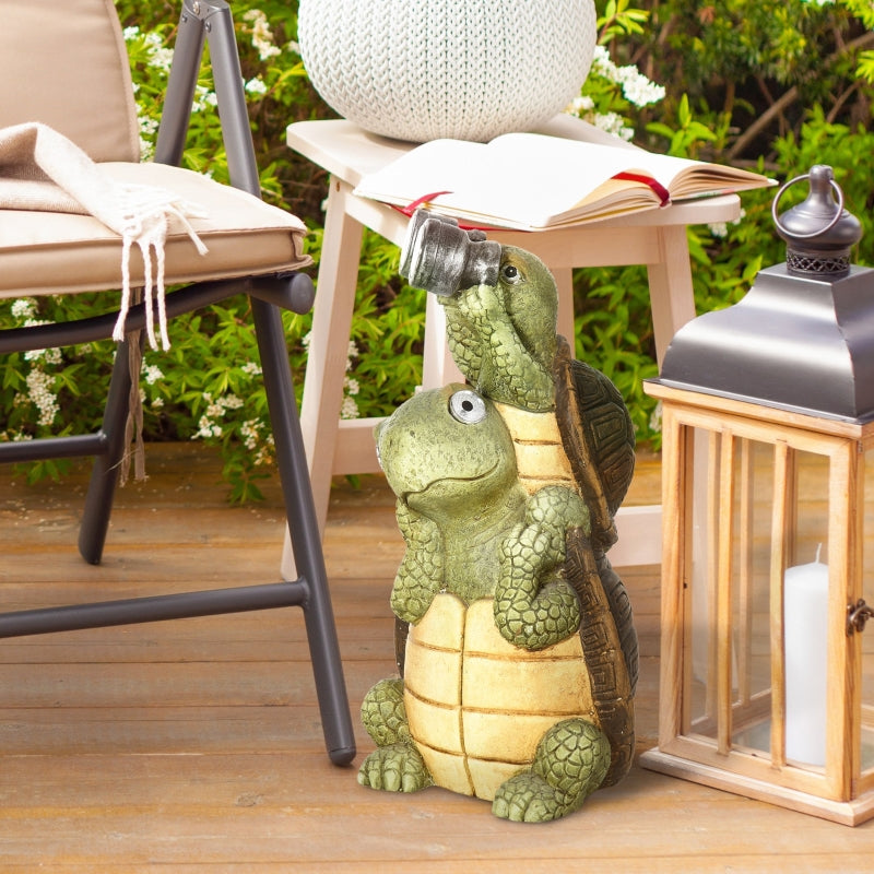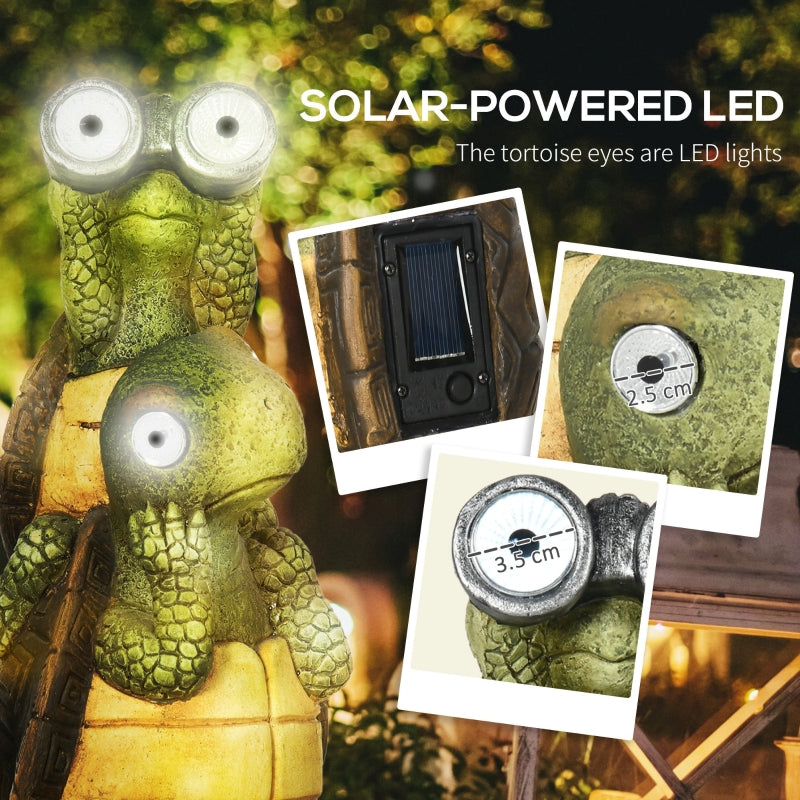 A bit monotonous in the garden Looking for an eye-catching decorative piece Let Outsunny funny ornament light up your garden. It's a small tortoise riding on a bigger tortoise and looking into the distance through binoculars. Their eyes are LED lights powered by solar energy. When you come home at night, there is always bright lighting to welcome you. This solar garden ornament will definitely touch your heart with its both decorative and functional design.